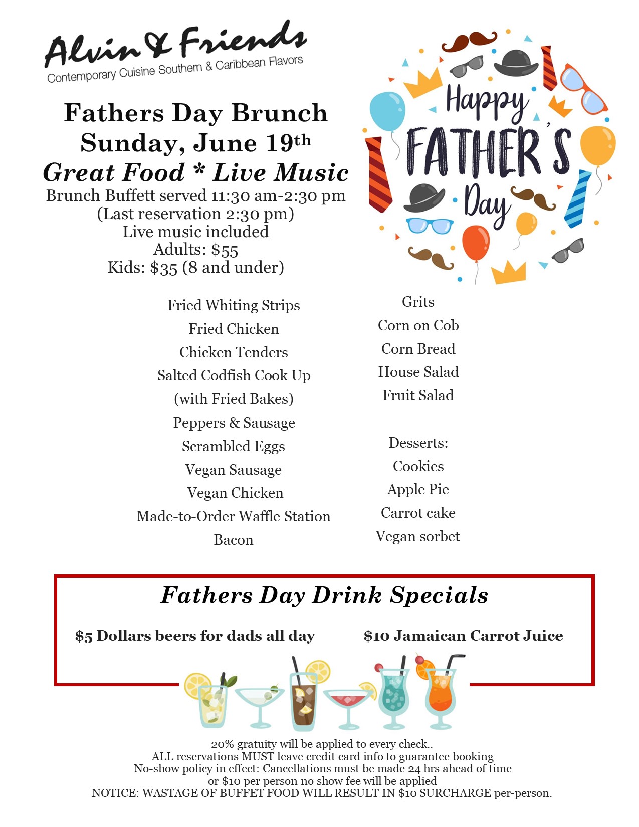 On Sunday, June 19th treat Dad to a great Brunch Buffet with live music at Alvin & Friends. Brunch will be served from 11:30 am-2:30 pm (Last reservation 2:30pm) Adults: $55, Kids: $35 (8 and under). Drink Specials: $5 Beers for Dads all day, $10 Jamaican Carrot Juice